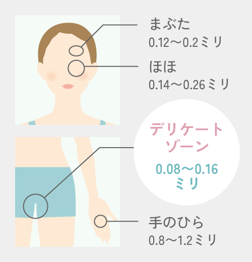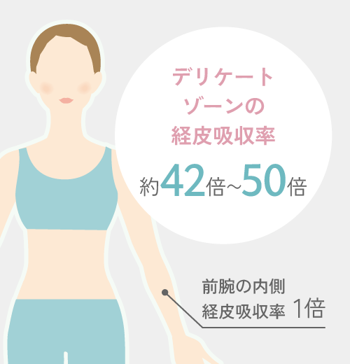 デリケートゾーンは、皮膚から成分が吸収される割合を示す経皮吸収率が、前腕の内側の約42〜50倍。石鹸などに含まれる化学合成物質などが他の部位に比べ体内に吸収されやすいため、専用のケアアイテムを使用しましょう。