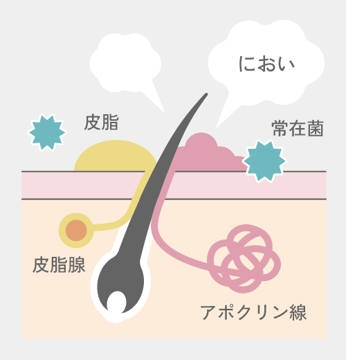 デリケートゾーンには、アポクリン汗腺が多く存在します。汗腺からでる分泌物が皮膚上の細菌によって分解されるとワキガ臭などの体臭の原因に。臭いの原因を防ぐために、皮膚環境を整える適切なケアが大切です。。