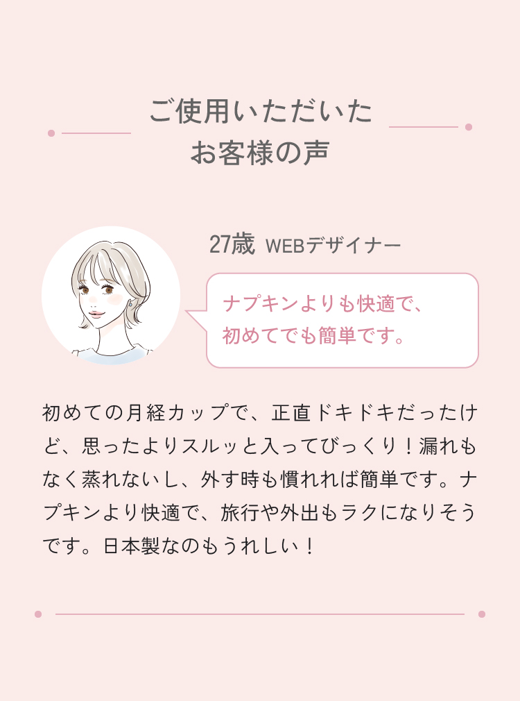 膣口より挿入した本品が膣内内壁に密着しとどまることで、経血もしくは他の膣分泌物を回収します。