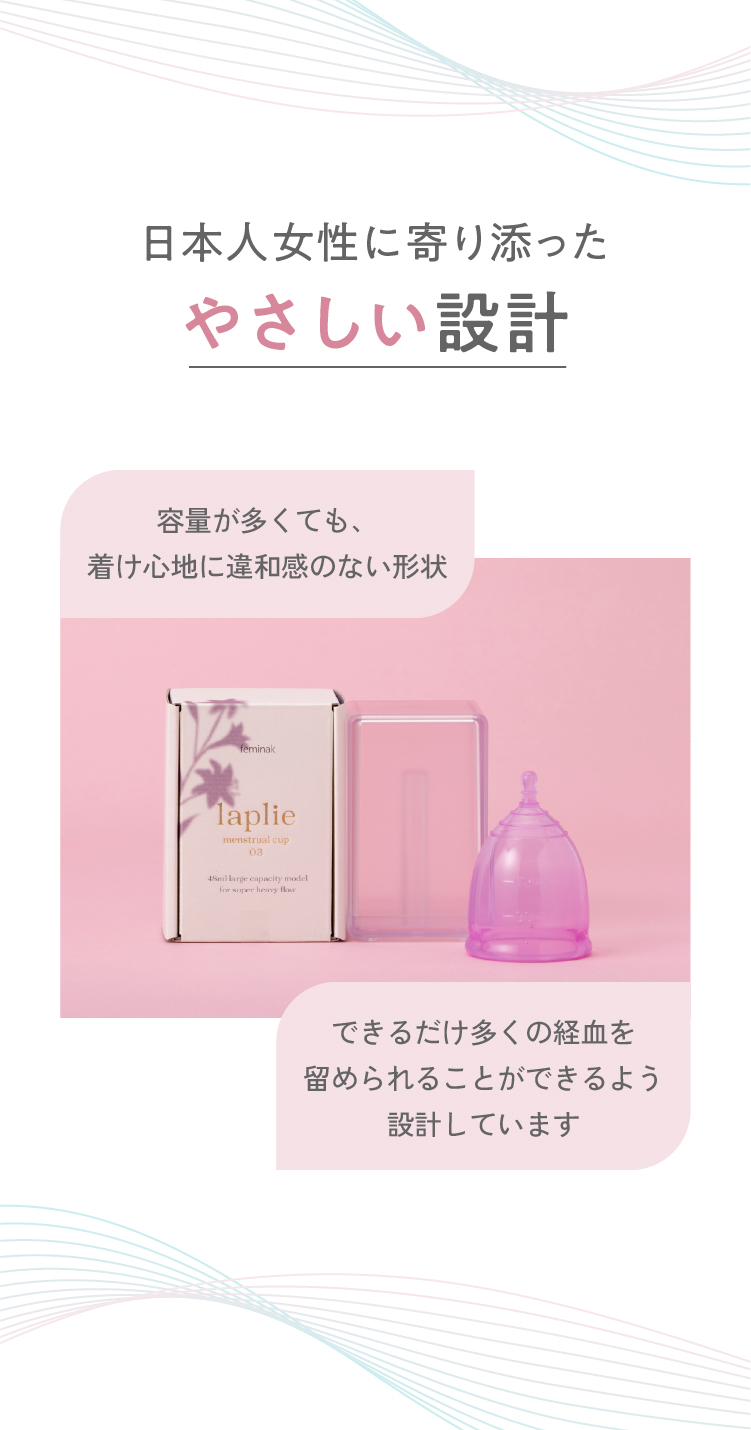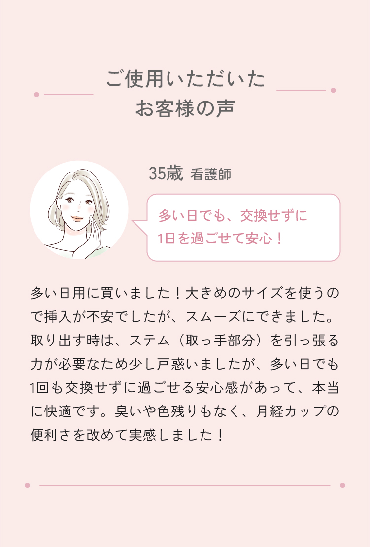 膣口より挿入した本品が膣内内壁に密着しとどまることで、経血もしくは他の膣分泌物を回収します。