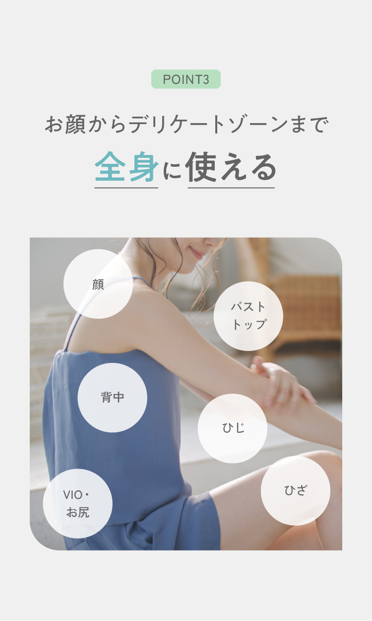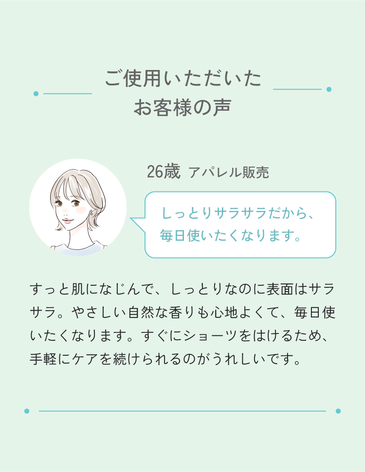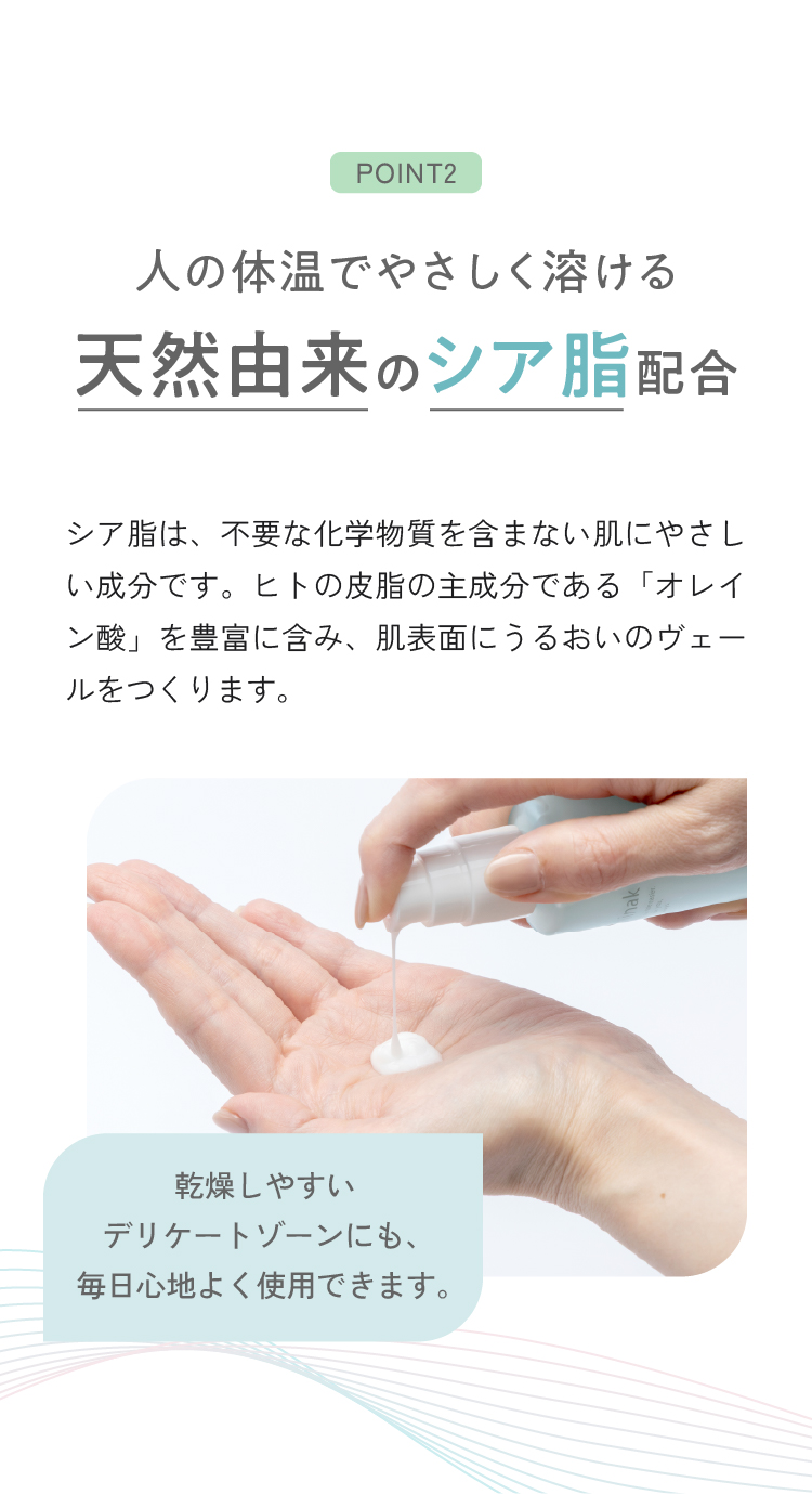 敏感な肌にもやさしい弱酸性で、かゆみやニオイをケア。肌にスッと馴染む使用感です。
